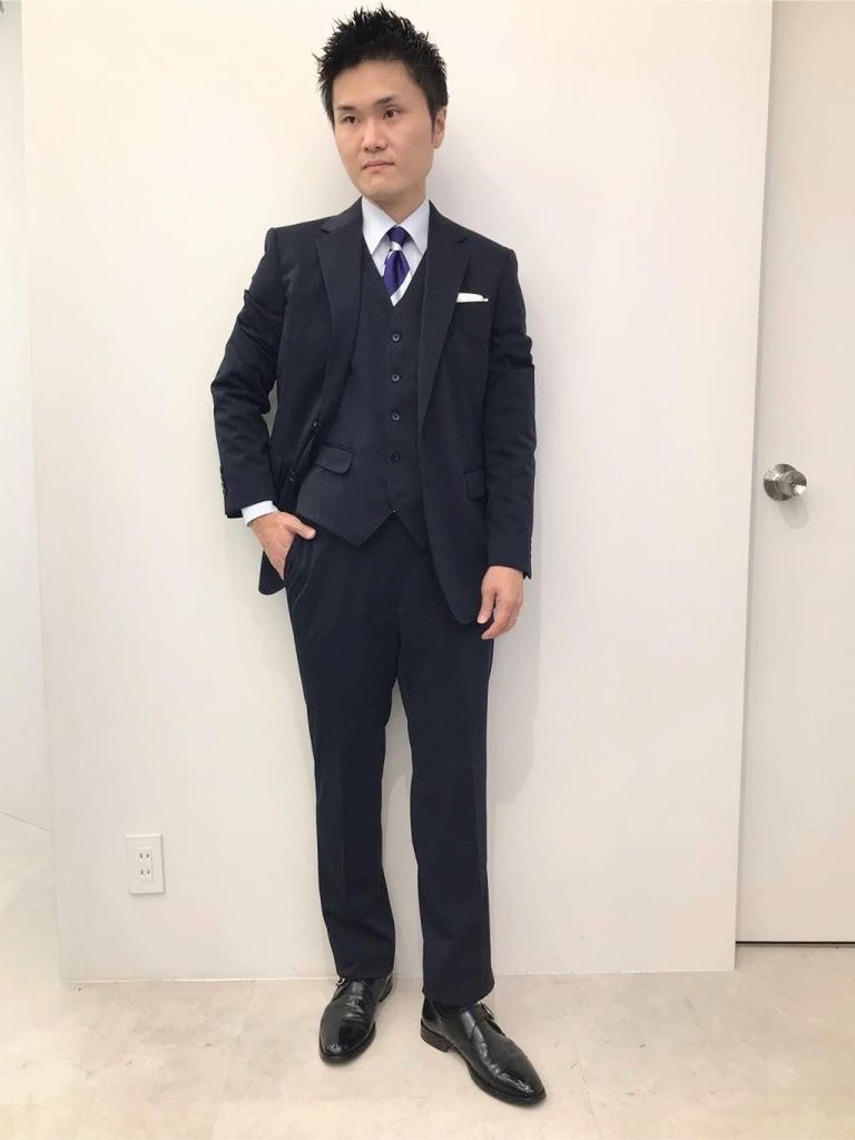 ネイビーの無地のスーツにベストを着用した、シンプルながらも清潔感のあるコーディネートです。スーツ・ネクタイ・ベストの色を同一色にまとめることで、統一感のある着こなしに仕上げています。