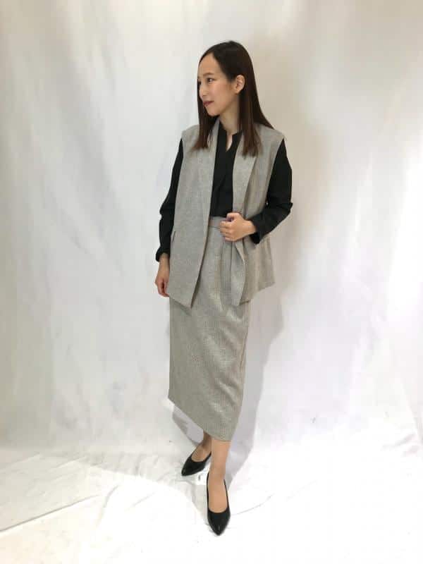暑くてジャケットを羽織るのに抵抗がある夏でも、かっちりとしたスタイルがふさわしい場面もあります。そんなときは、軽やかに着用できるジレセットアップを選んでみてはいかがでしょうか。シンプルな黒ブラウス×ロングタイトスカートに上品なライトツイードのジレを羽織れば、一瞬できちんとした印象になります。