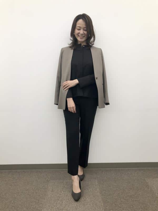黒のゴールドパーツブラウス×テーパードパンツのセットアップに、大人のこなれ感たっぷりのグレージュのジャケットを羽織った、万能着痩せコーディネートです。黒のセットアップは全体を縦長に見せる効果が期待できるため、ほっそりとした印象をあたえてくれます。黒ブラウスのゴールドパーツがおしゃれで、ジュエリーを付けなくてもデコルテが華やかに見えるのが魅力です。