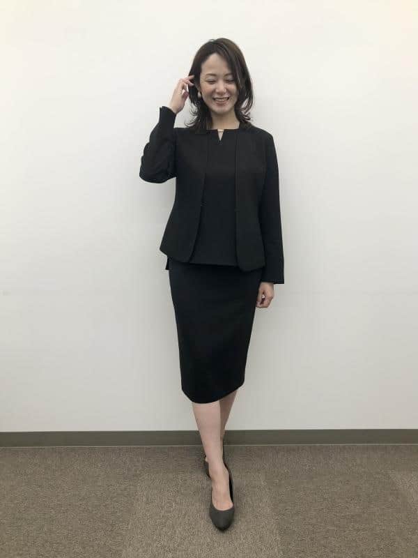 ジャケット・タイトスカート・黒ブラウスの3点が共地のセットアップコーディネートです。黒のアイテムは、かっちりとしたスタイルがふさわしい場面で大活躍してくれます。着回し方次第では幅広い場面で活用できるので、黒のセットアップと黒ブラウスの3点を揃えておくと便利です。黒ブラウスにジャケットを羽織り、お手持ちの明るいカラーのパンツを合わせれば、オフィスカジュアルとしても着回せます。