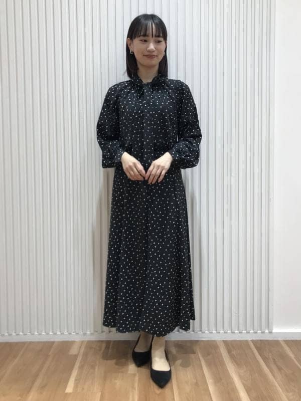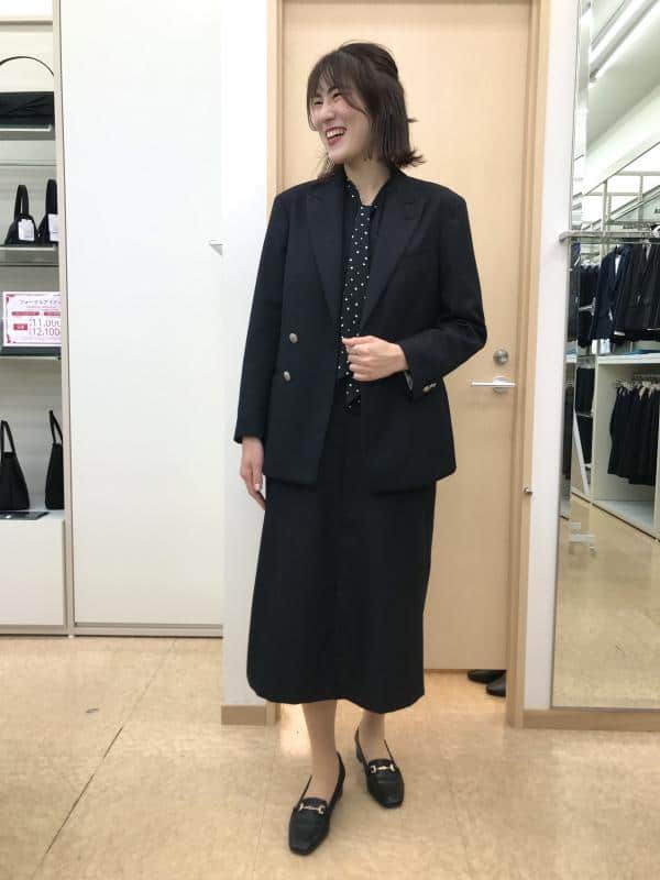 ドット柄のセットアップは、可愛さのなかにもきっちり感が出せるコーディネートです。ジャケットを羽織ることで、少し堅めのシーンでも着用できます。黒ベースのドットなので着こなしやすく、ブラウス・スカートをそれぞれ単品で使用できるため、コーディネートの幅が広がるのもうれしいポイントです。