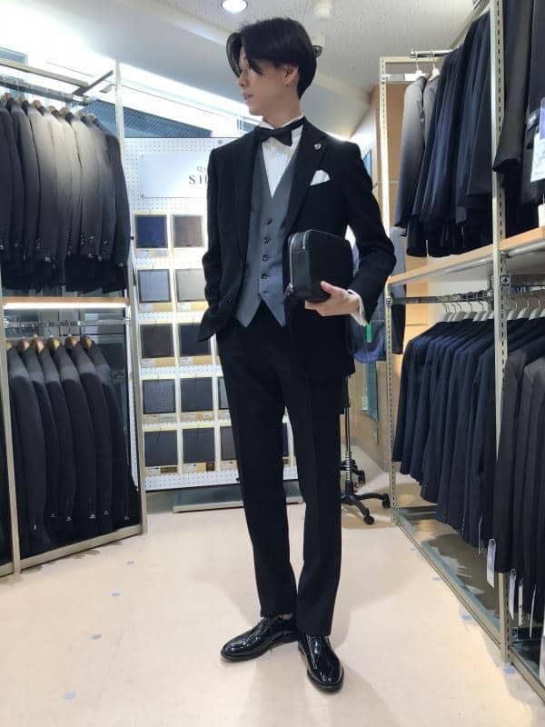 ブラックスーツにグレーのベストを合わせた、結婚式ゲストの王道フォーマルスタイル。シンプルなモノトーンの組み合わせに蝶ネクタイをプラスするだけで、ぐっと上品で洗練された印象に。