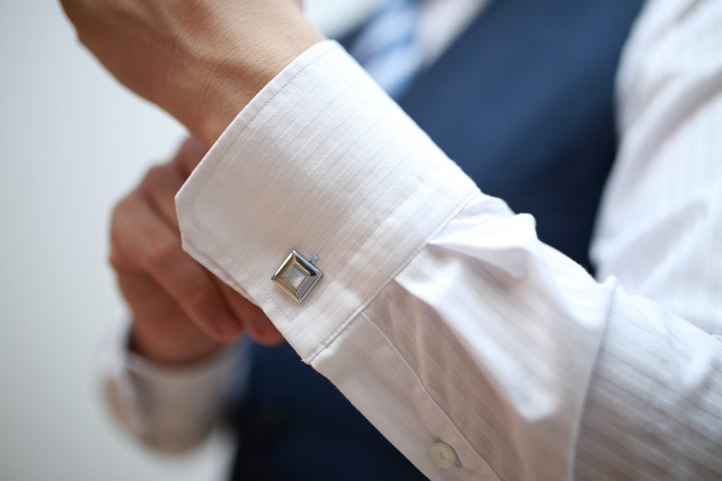 カフスボタン(カフリンクス)は、シャツの袖口に付けるフォーマルアクセサリー。通常のボタンシャツよりもドレッシーな印象になり、結婚式などのフォーマルシーンでよく使われます。
