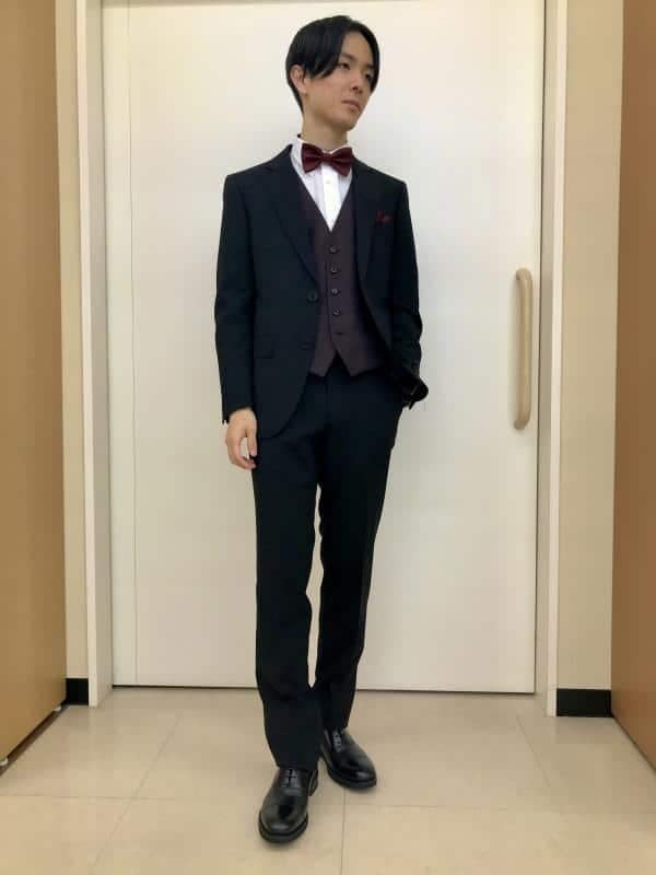 ブラックスーツにボルドーの蝶ネクタイを合わせた、華やかさのあるサマーフォーマルコーデです。落ち着いた色味のスーツに深みのあるボルドーを取り入れることで、結婚式らしい華やかな印象を演出。ベストにもボルドー系のカラーを合わせることで、コーディネートに統一感をプラス。