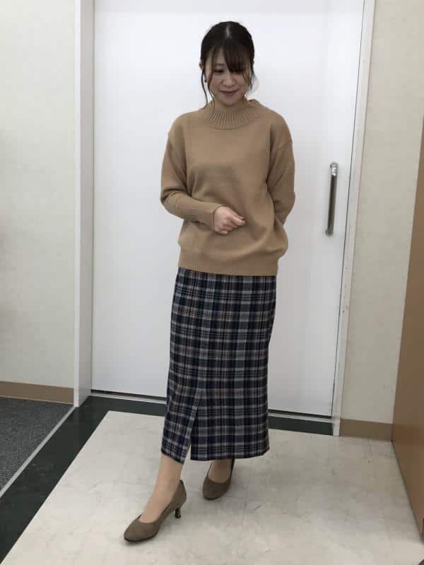 優しい色味のトップスと柄スカートの組み合わせは、冬のオフィスにもぴったり。足元はベージュ系のパンプスでトーンをまとめつつ、上品に仕上げています。シンプルだけどどこか目を引く、バランスの良い冬コーデです。