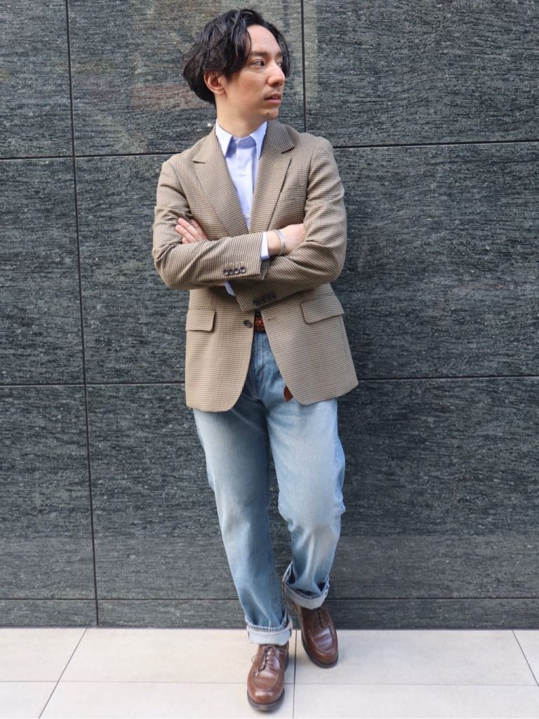 ベージュのジャケットにデニムを合わせた、ほどよく上品なカジュアルフォーマル。ブラウンのシューズを合わせることで、かっちりしすぎない大人のジャケットスタイルに。