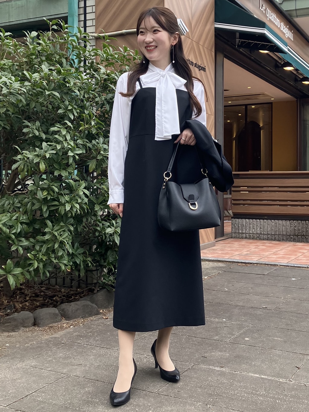 ブラックを基調にしたワンピースにボウタイブラウスを合わせた、甘くなりすぎないカジュアルフォーマル。