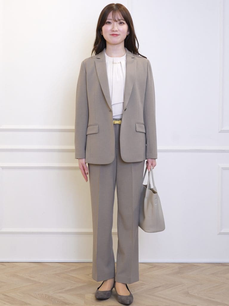 グレージュのスーツを主役にした、やわらかく上品なカジュアルフォーマル。小物アイテムもワントーンカラーでまとめることで、シンプルながらもこなれた印象に。