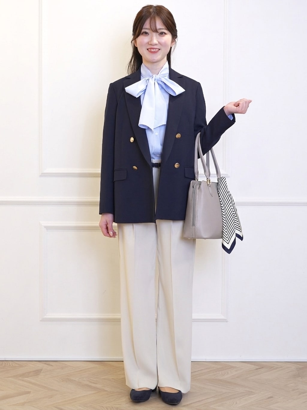 ネイビーのダブルジャケットにボウタイブラウスを合わせた、爽やかなカジュアルフォーマル。淡いブルーのブラウスが顔まわりを明るく、華やかに見せてくれます。