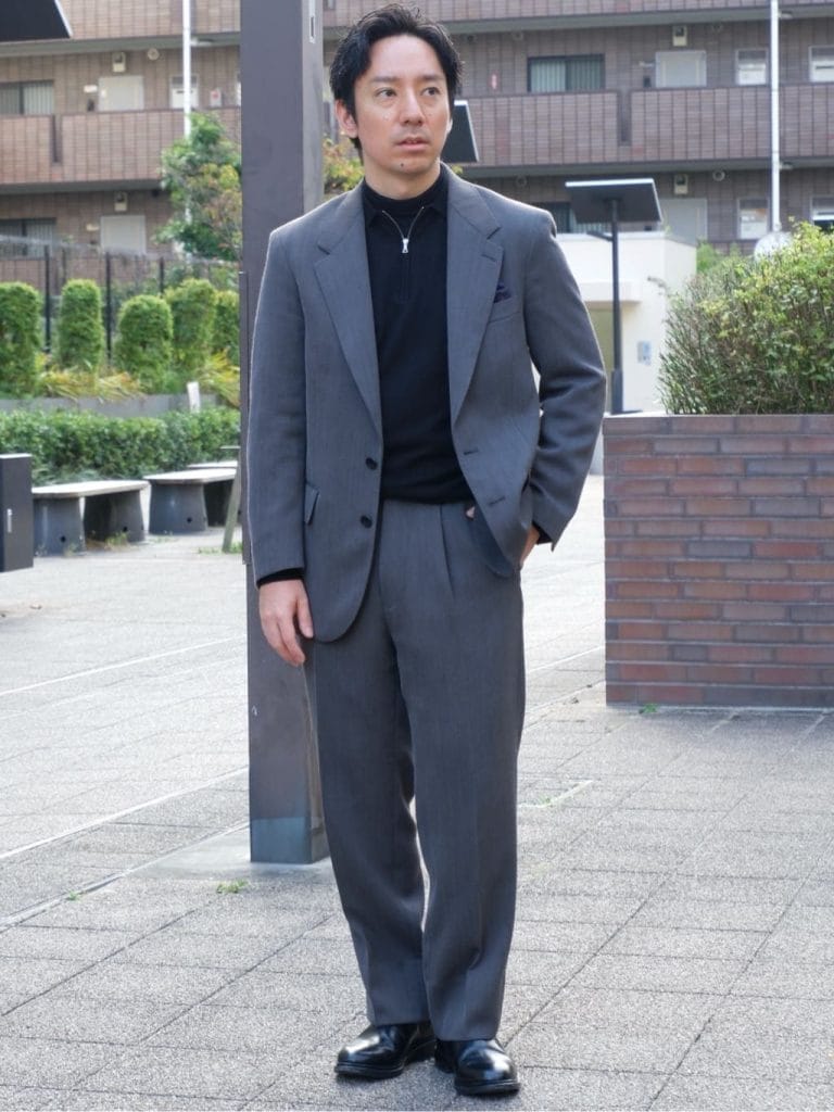 モアレスのトラディショナルなシルエットのスーツを合わせたコーディネート。昔流行ったスタイルを、現代風にアレンジしています。インナーにはニットポロを合わせることで、フレッシュな雰囲気に。