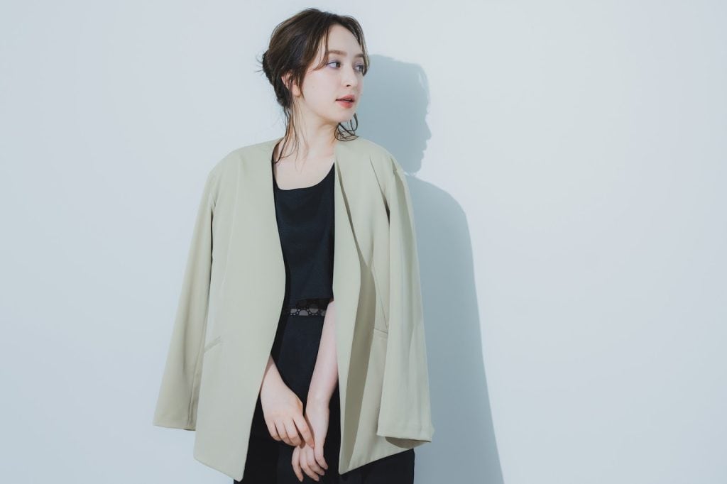 カジュアルな雰囲気の会では、すっきりしたノーカラージャケットがぴったり。