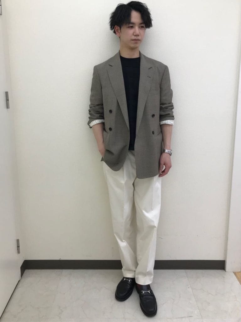ベージュチェック柄のダブルジャケットとホワイトのストレートパンツを合わせた、上品なカジュアルフォーマル。インナーとシューズをブラックで引き締めることで、全体にメリハリが生まれます。