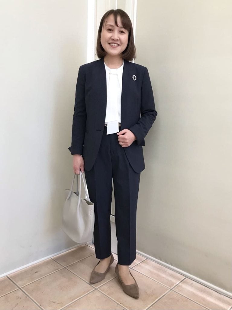 暗い印象にもなりやすいネイビーですが、トップスとパンプスに明るい色味を合わせることで爽やかな装いになります。アクセサリー付きのブラウスで華やかさをプラスすれば、セレモニーにぴったりのコーディネートの完成です。