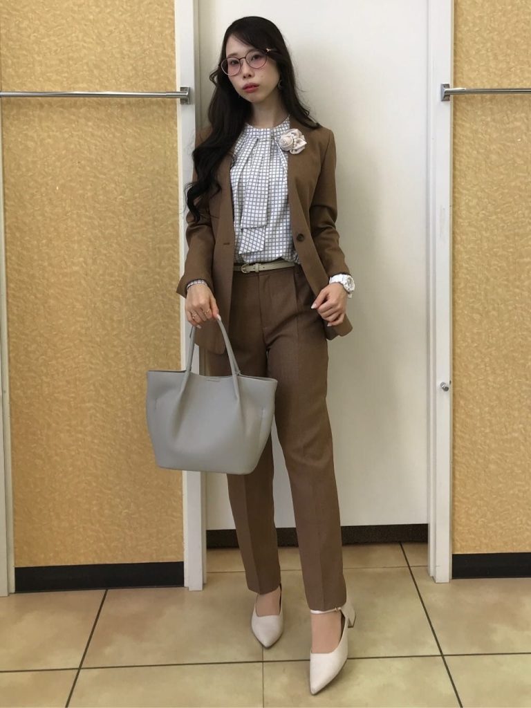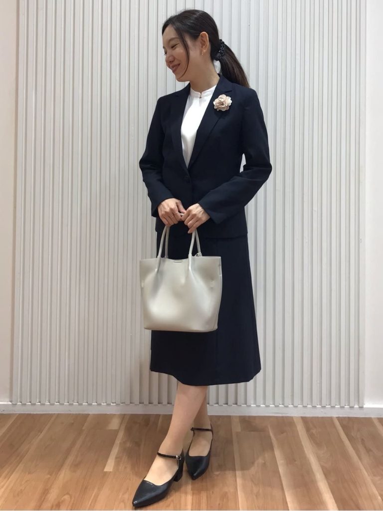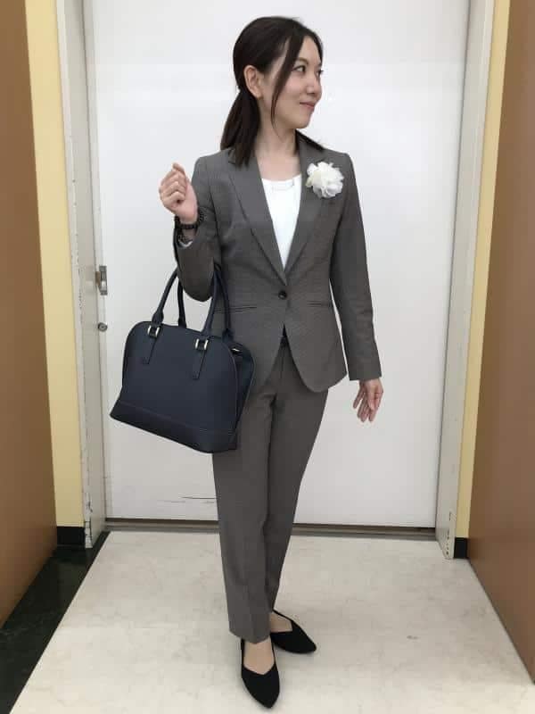 インナーやバッグ、靴は落ち着いた色でまとめることで、コサージュが主張しすぎず上品な印象に。卒業式後はコサージュを外せば、そのまま仕事着としても着用できます。実用性を重視したい方にもおすすめのコーデです。