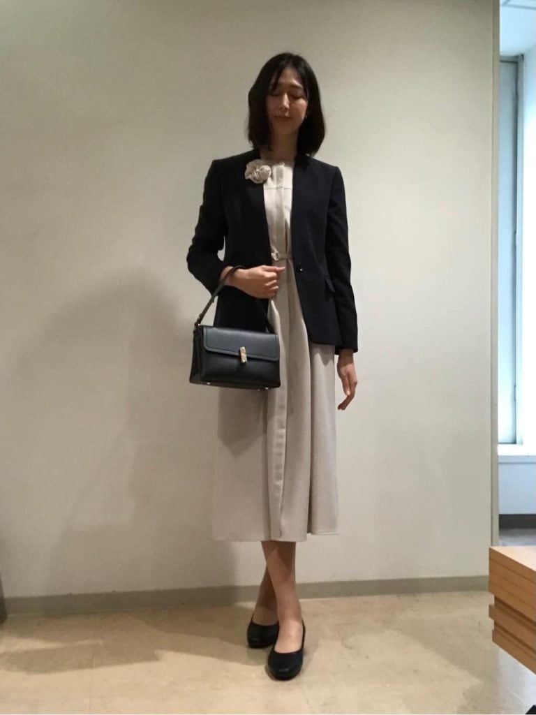 ネイビーのジャケットとベージュのワンピースを組み合わせた、クラシカルで上品な印象が際立つスタイリングです。胸元のフラワーアクセサリーが華やかさを添え、女性らしさを引き立てます。足元は黒いパンプスでまとめ、バッグも黒で統一することで、フォーマルな場面にもふさわしいエレガントなコーデです。