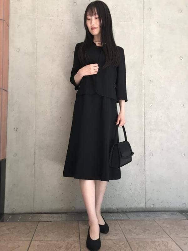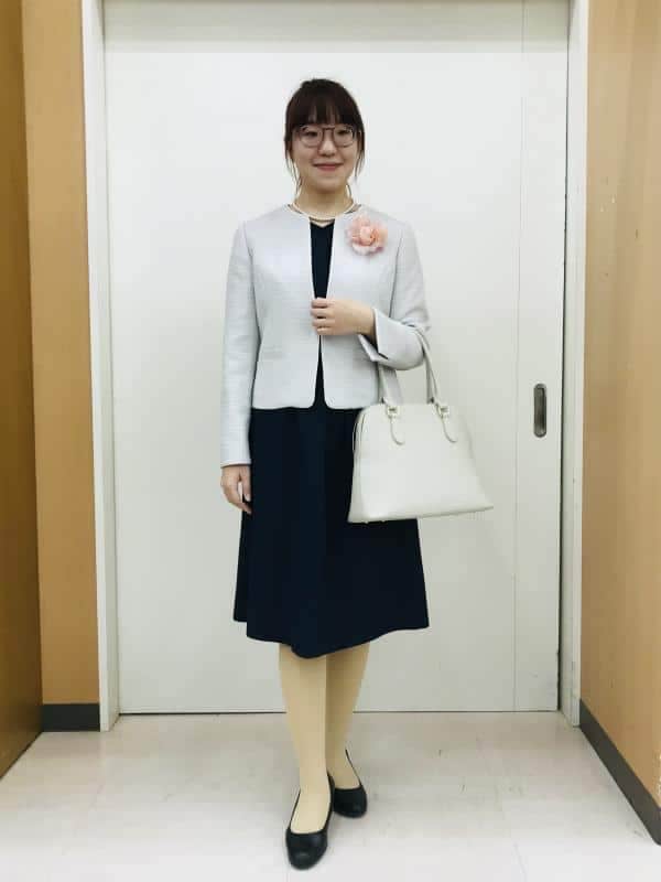 ライトトーンのジャケットとバッグにブラックのワンピース、パンプスを合わせたコーデです。コサージュを胸元につけると、より一層華やかな雰囲気にしあがります。パンプスは小柄な方でもすらっと見える5センチメートルヒール。着脱可能なストラップ付きで、3通りの履き方を楽しめます。アンクルや足の甲にストラップをとおしておけば、パンプス特有のパカパカ感がなく快適です。