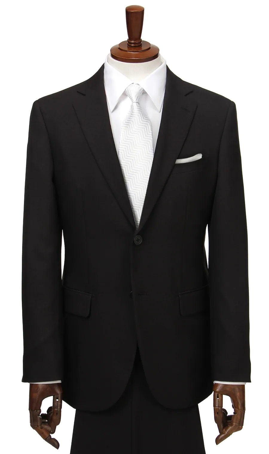 黒無地の上下共生地のスーツ。結婚式や式典などの一般的な慶事列席の際に着用可能。