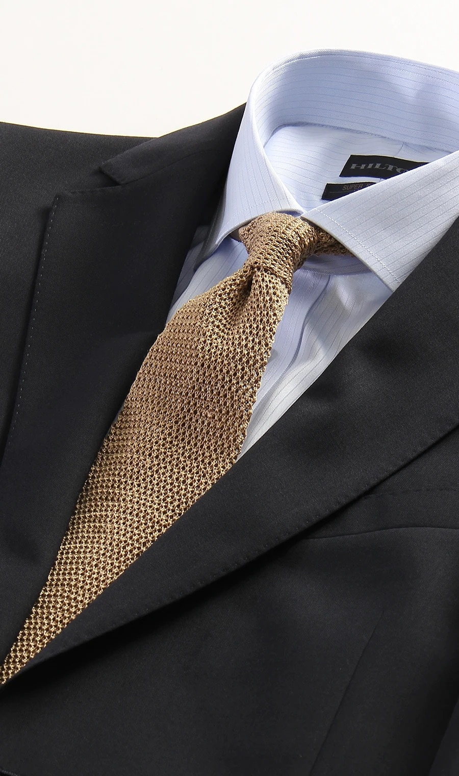 ニット編みのネクタイ。通常のネクタイと比べると、カジュアルで遊び心のある印象になります。