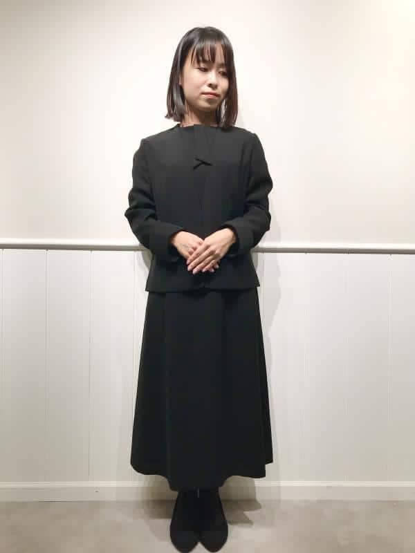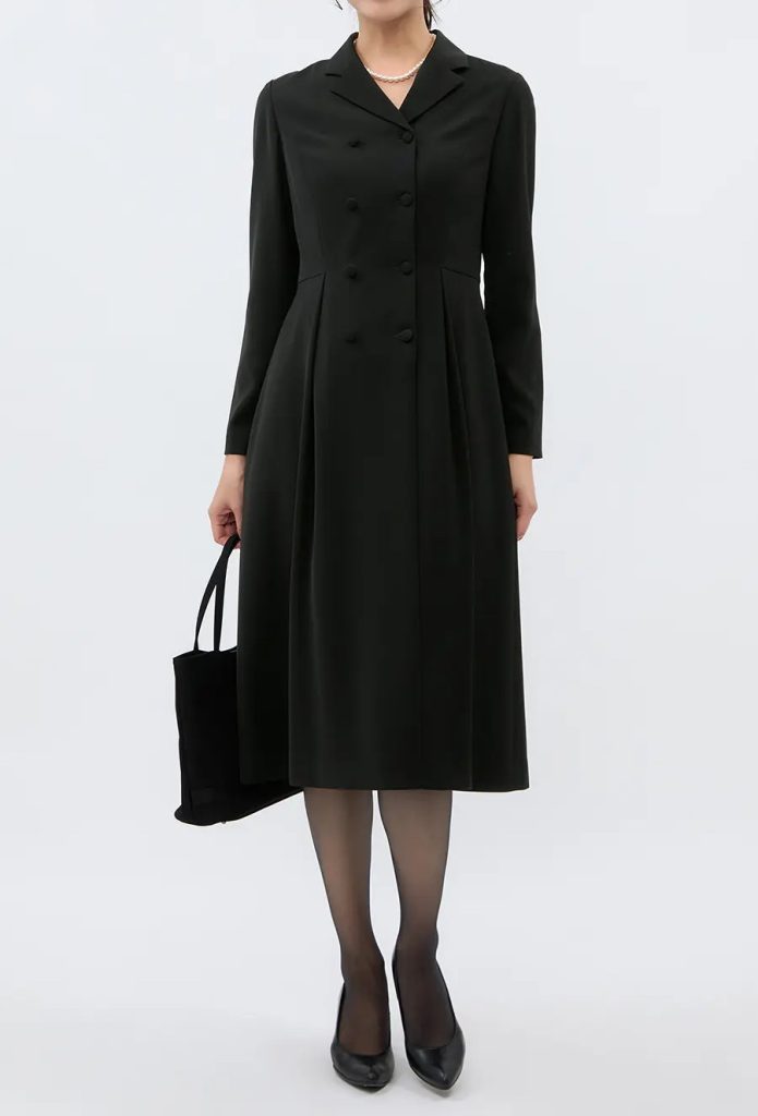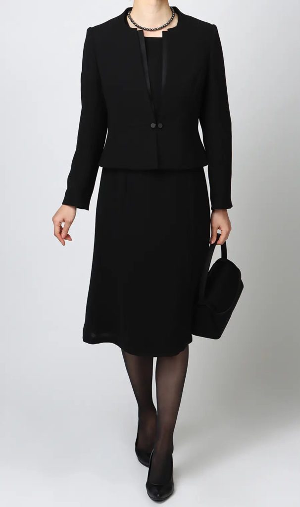 ワンピースの付け外しができるボウタイがポイントのワンピースです。喪服としてはもちろん、様々なシーンで自由な着こなしを実現できます。ジャケットは長めの着丈を選ぶことで、気になる腰周りをしっかりとカバーできます。