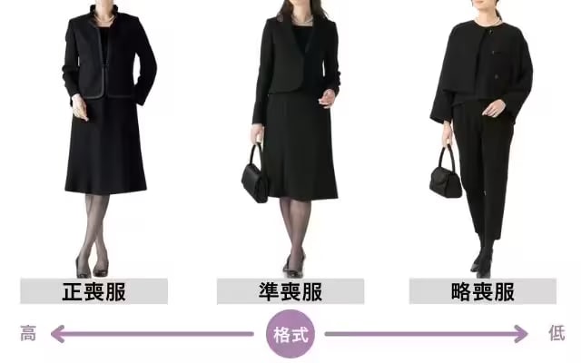 法事では、参列者の立場や法要の時期によって、求められる服装の格式が異なります。ここでは、正喪服・準喪服・略礼服の違いと、それぞれの主な着用シーンについてまとめました。