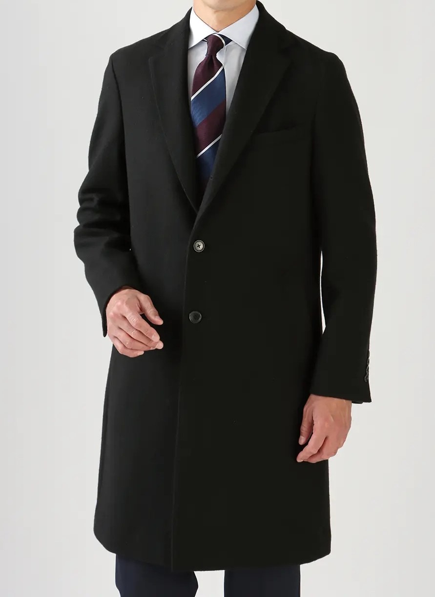 黒のチェスターコートであれば、シーンを問わず冠婚葬祭から日常のオン・オフまで着用できるため、1着持っておきたいマストアイテムです。