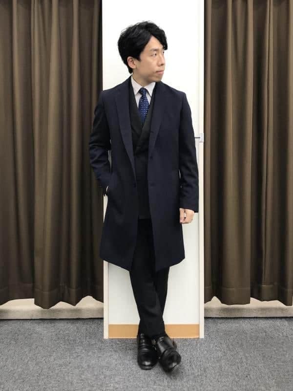 親族や主賓として出席する場合は、フォーマルな装いが基本となるため礼服を着用します。合わせるコートは、最もフォーマル度の高い「黒のチェスターコート」がおすすめ。正統派のブラックコーディネートは、どんなシーンでも外せない王道のスタイル。足元も黒のストレートチップで品格をキープしましょう。