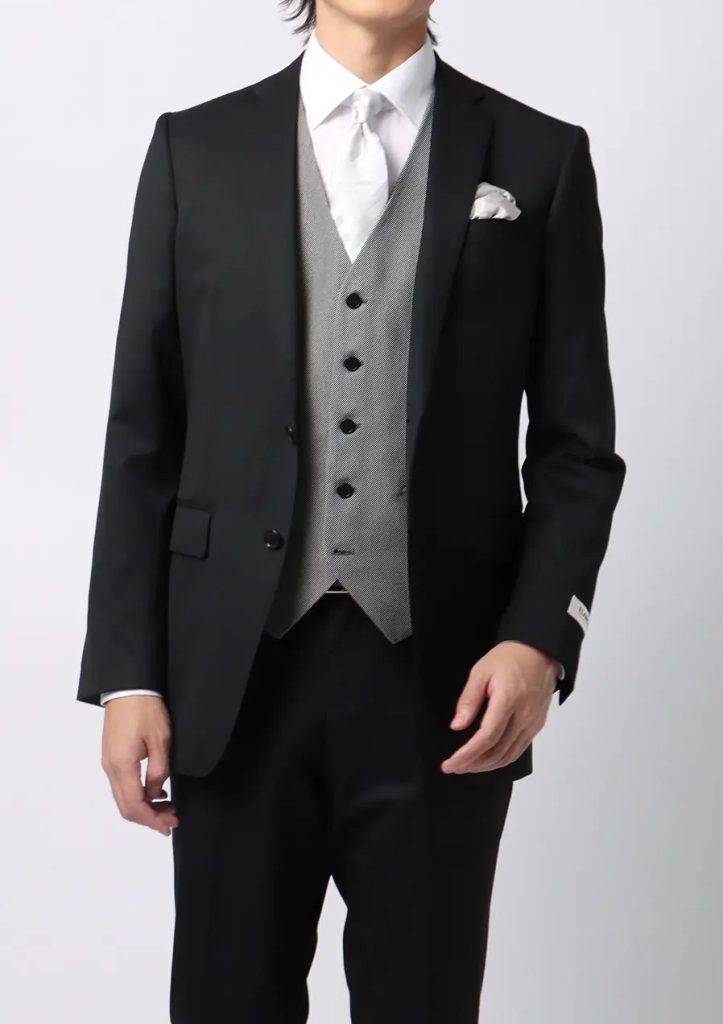 冬場の結婚式では、コートの下にスリーピーススーツのベスト(ジレ)を重ねるのがおすすめ。防寒対策になることはもちろん、コートを脱いだ瞬間もきちんと感をキープできるのが魅力です。室内でもだらしなく見えず、セレモニーらしい装いに。