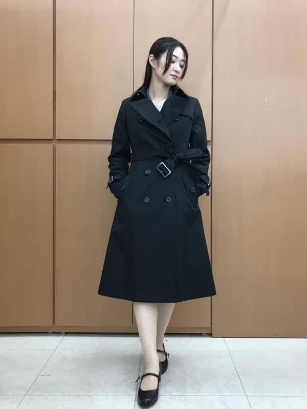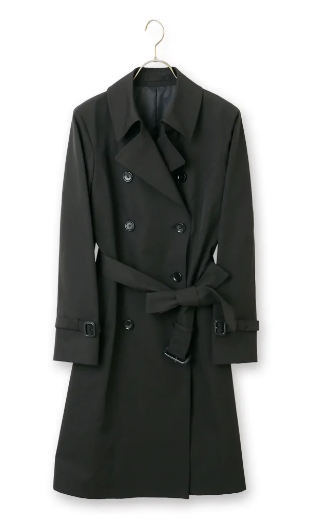 アウターをスッキリ着こなしたい方は、シルエットが美しいトレンチコートがおすすめ。なかでもブラックのトレンチコートは、見た目の引き締め力が抜群です。ウエストのベルトを閉めれば、女性らしいメリハリのあるシルエットを作り出せます。