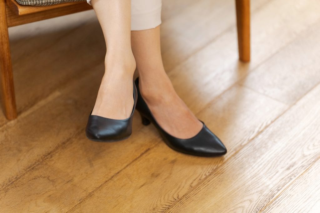 足元はベルトの黒に合わせて黒のパンプスでまとめることで、秋らしい雰囲気に。