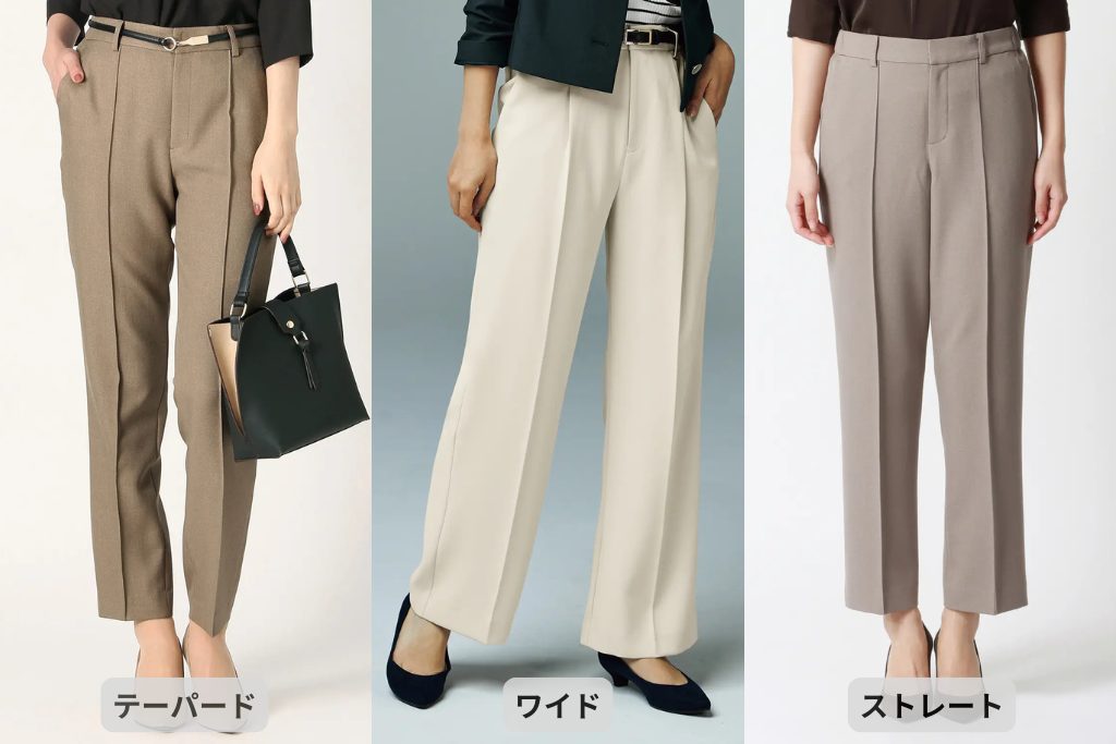 着回し力を重視するなら、体型を拾いすぎずすっきりと見せてくれるシルエットが大活躍。なかでもおすすめなのが「ストレート」「ワイド」「テーパード」の3タイプ。