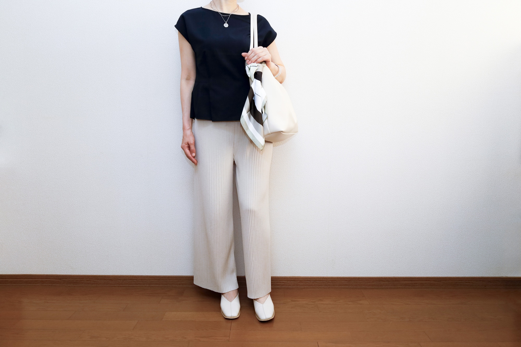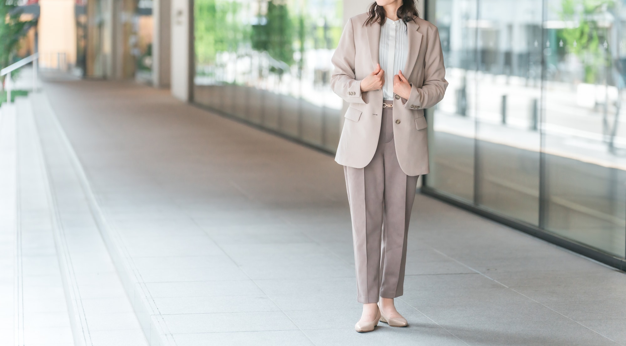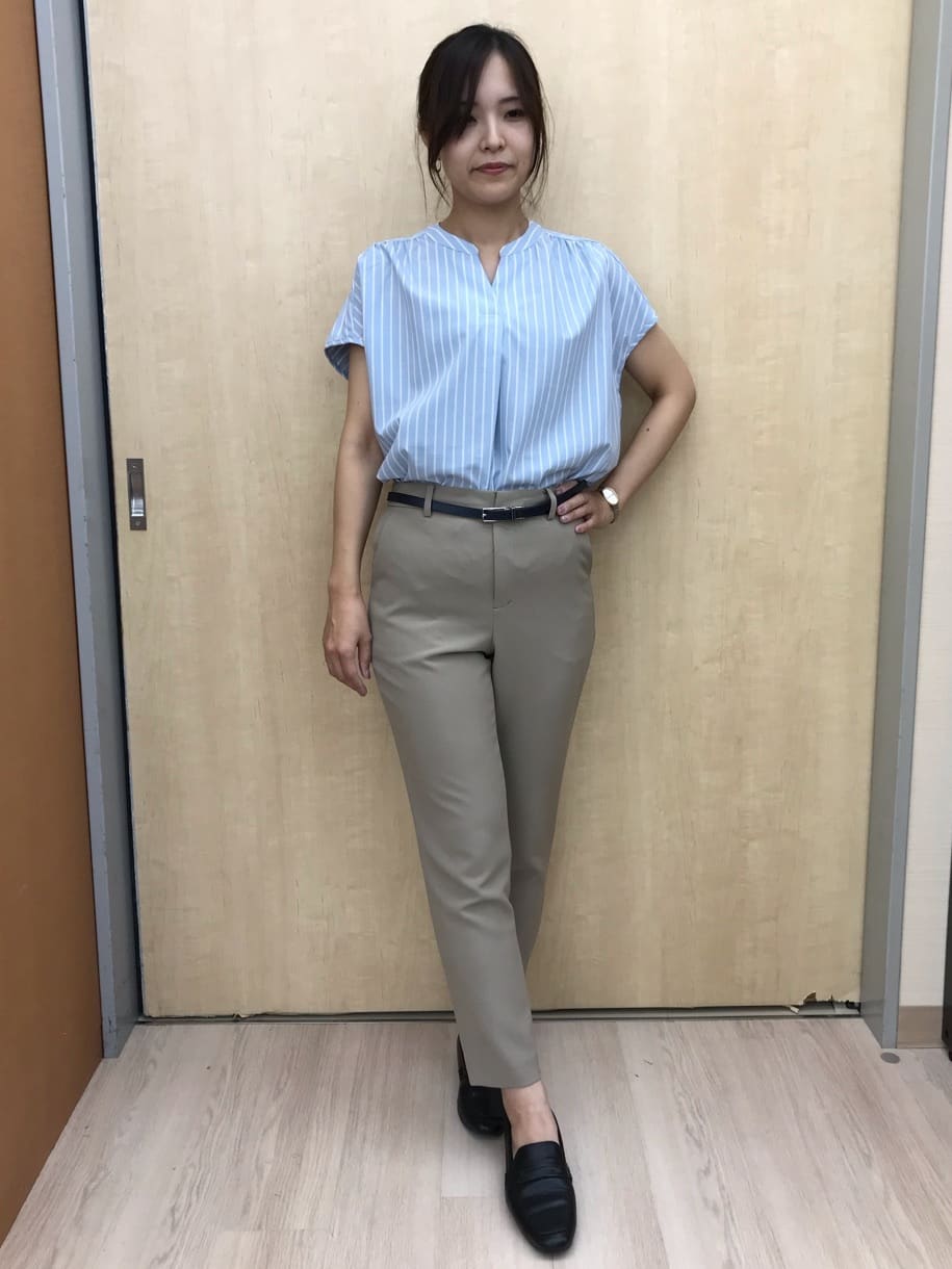 ベージュパンツは、トップス次第で印象が大きく変わるアイテム。オフィス通勤に着用するなら、特に「とろみ素材」のブラウスや「きれいめニット」を合わせるのがおすすめです。