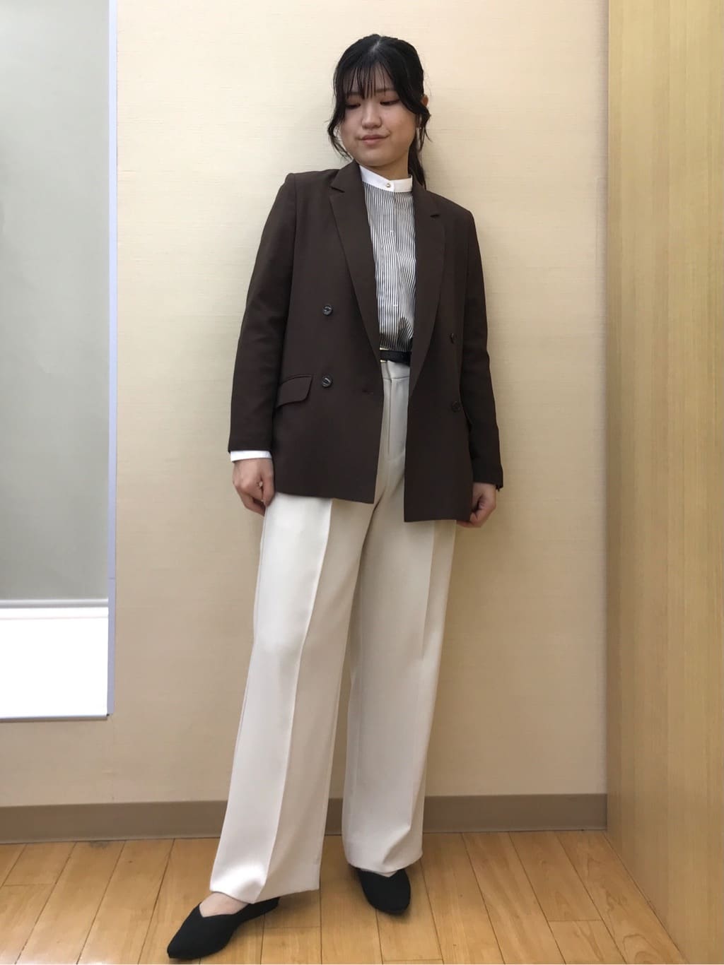 冬の寒さ対策には、しっかり重ね着をするのがおすすめ。ストライプのシャツにブラウンのジャケットを合わせて、ワイドのベージュパンツで少しカジュアルダウンさせた着こなしです。