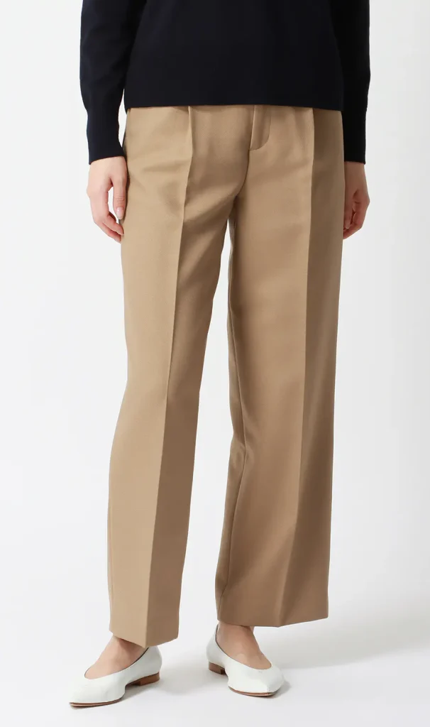 着心地の良いベージュパンツは、ノータックできれいめシルエットな優れもの。シャツをタックインすることで、ウエスト位置が高く見えて脚長効果もアップします。