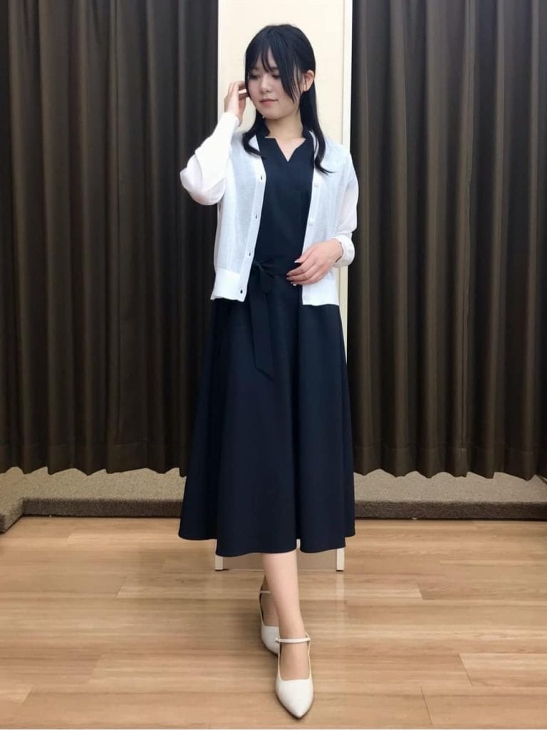 ウエストマークのあるデザインやストレートシルエットのものを選べば、オフィスにもふさわしいすっきりとした印象に。丈の短すぎるものは避けるようにして、膝が隠れる程度の丈感を意識しましょう。
