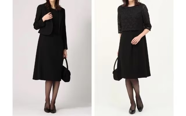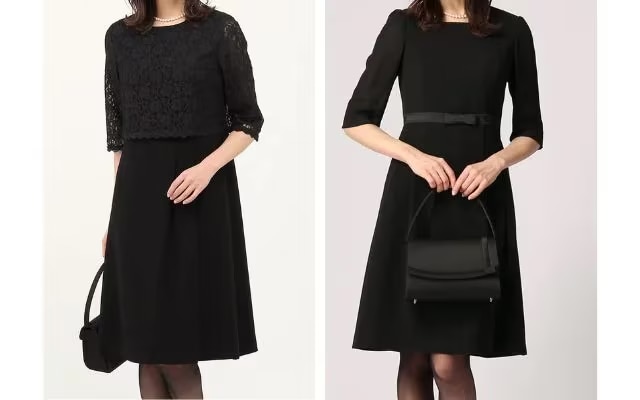 洋装の場合、露出と装飾を抑えたデザインのブラックフォーマルを着用しましょう。前述のとおり洋装においては正喪服と準喪服に大きな差はありませんが、準喪服では平リボン、レースなど、控えめな装飾が施されたデザインでもマナー上問題なく着用できます。