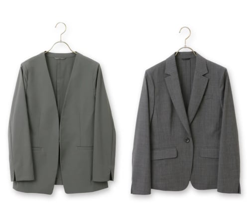 グレースーツはデザインの幅が広いので、自分の体型や着用シーンに合ったものを選びましょう。ノーカラーのジャケットは女性らしいやわらかさ、テーラードジャケットはかっちりとした知的な印象を演出できます。