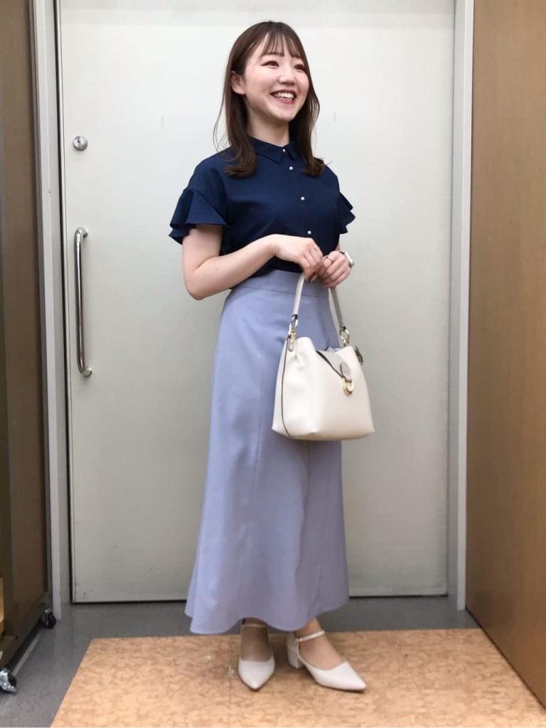 ネイビーのフリル袖ブラウスに、ブルー系のマーメイドスカートを合わせた、女性らしい印象の私服面接コーデ。パールボタンがアクセントとなり、控えめながらもフェミニンな雰囲気が感じられる組み合わせです。