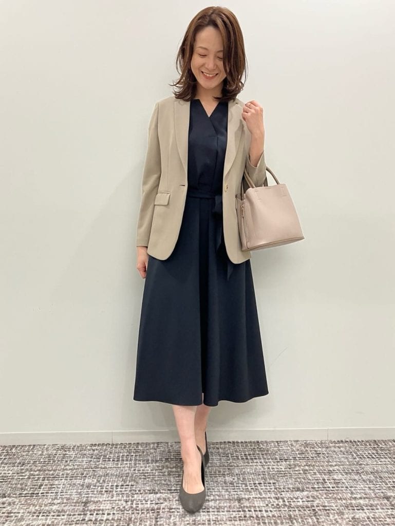 ネイビーのワンピースに、ライトベージュのジャケットを合わせたきれいめスタイル。濃色×明色のコントラストが顔まわりを明るく見せ、面接の場でも落ち着いた印象を与えやすいコーデです。