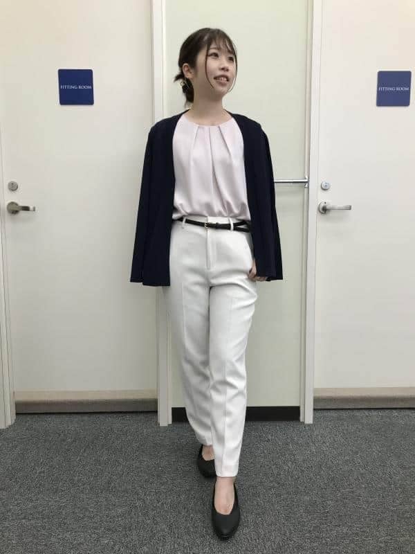 淡いピンクのブラウスにホワイトのテーパードパンツを合わせ、ネイビーのカーディガンを羽織った清潔感のあるコーディネート。柔らかな色合いに濃色の引き締めを加えることで、きちんと感とやわらかさのバランスが取れた印象に仕上がります。