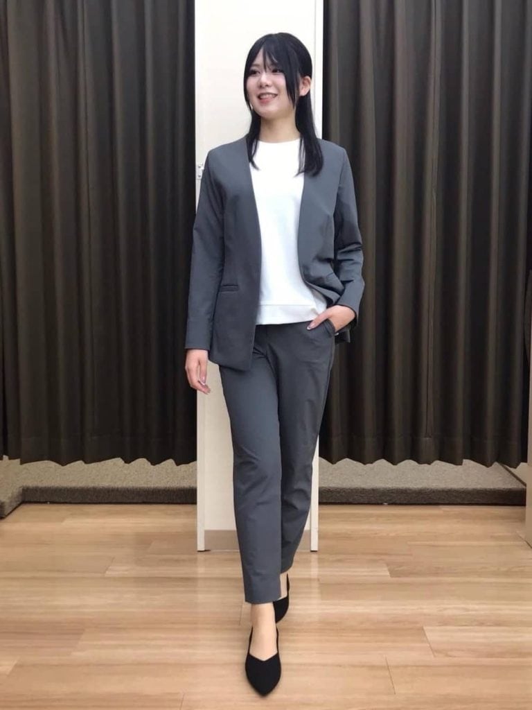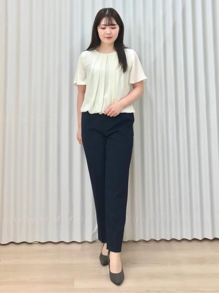 トップスは、ほどよくデザイン性がありながら控えめな印象で、面接にふさわしい品のある一枚。パンツはすっきりとしたラインで全体の印象を整え、動きやすさと見た目のスマートさを両立しています。