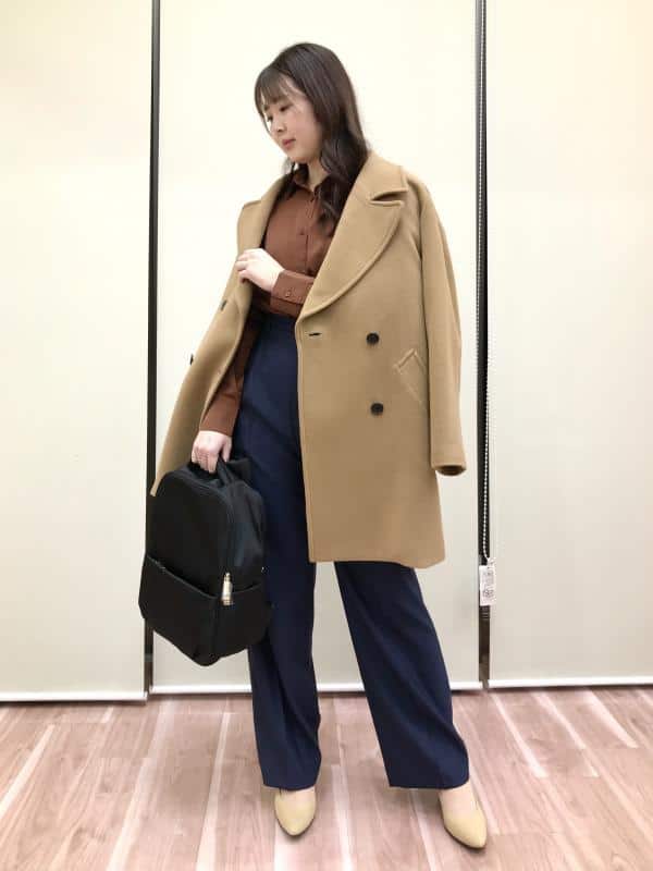 カシミアブレンドのダブルコートを使った大人のビジカジコーデです。コートと同系色のシャツとハイウエストのパンツとあわせて、コーデ全体のバランスを取っています。コートはショート丈のため、通勤や外回りでも動きやすく快適です。