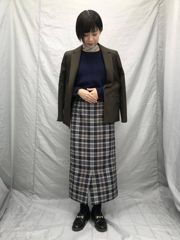 4.3.2. チェック柄のロングスカートがポイント!大人可愛いオフィスコーデ