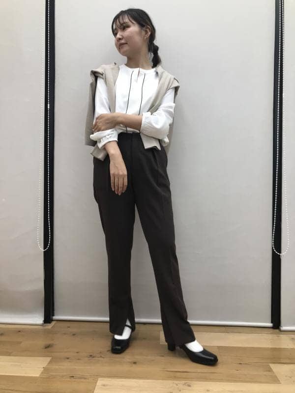 抜け感のある軽やかなブラウスコーデです。透け感を軽減する裏地付きのため、淡いホワイトでも安心して着用できます。ジャケットを羽織ってもカッコよく決まる万能オフィスカジュアルコーデです。