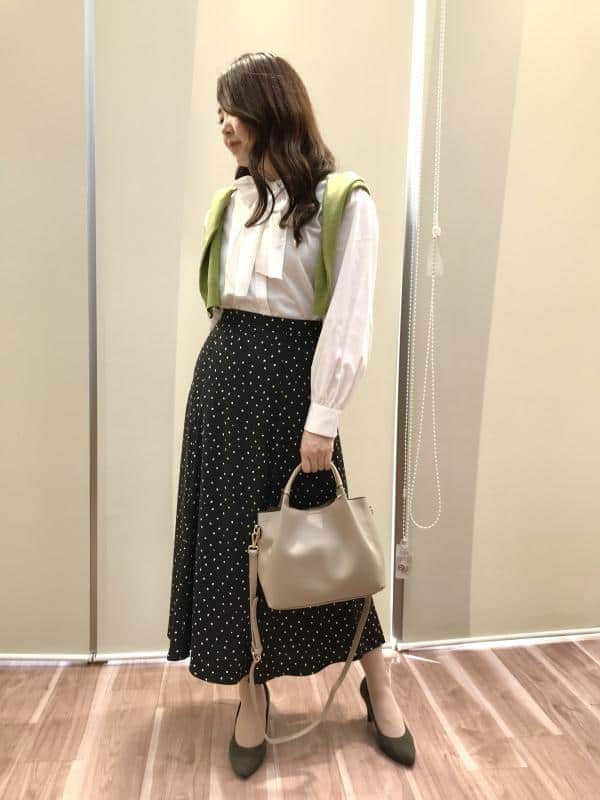 秋らしいおしゃれが楽しめる大人可愛いボウタイブラウスコーデです。ブラウス+フレアスカートの王道コーデに、差し色としてグリーンのニットをあわせています。女性らしい印象がありつつ甘すぎないため、大人の50代女性にぴったりです。