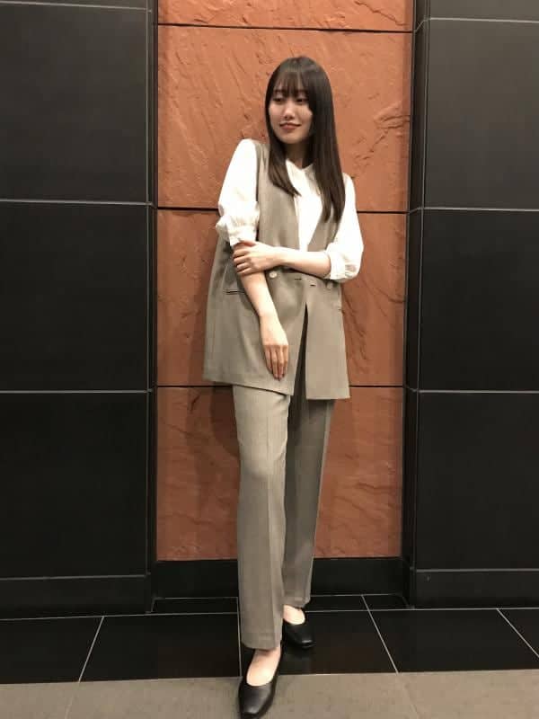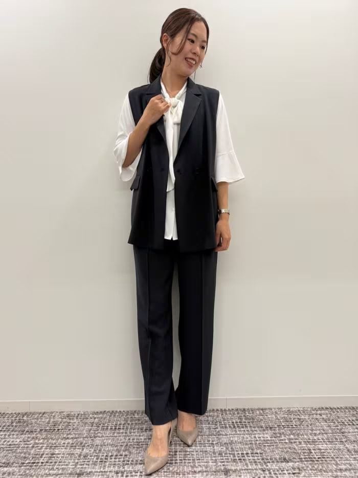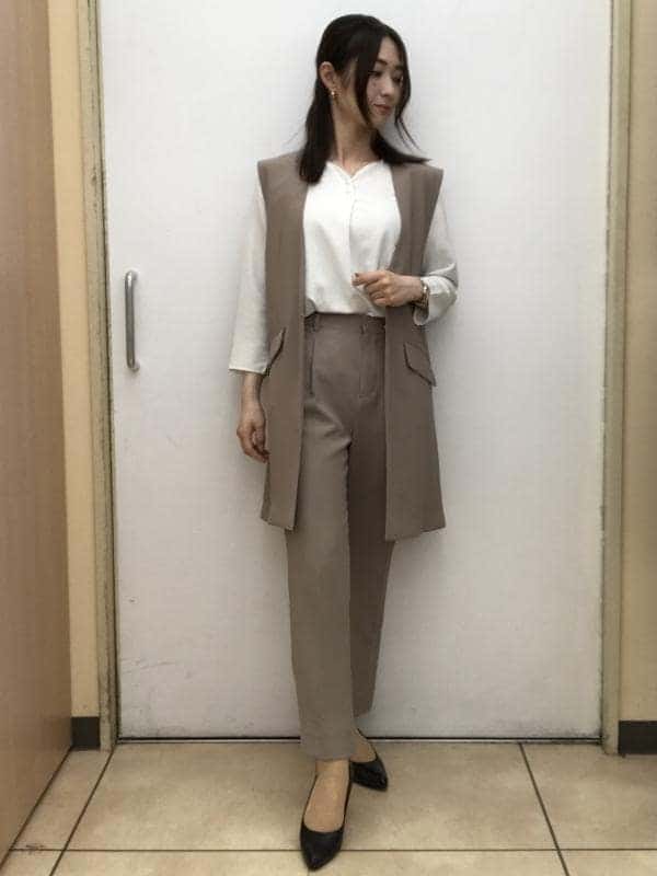 最後に、オフィスでも着られる、この春におすすめのジレコーディネートをご紹介します。毎日のオフィスコーディネートの参考にしてみてください。