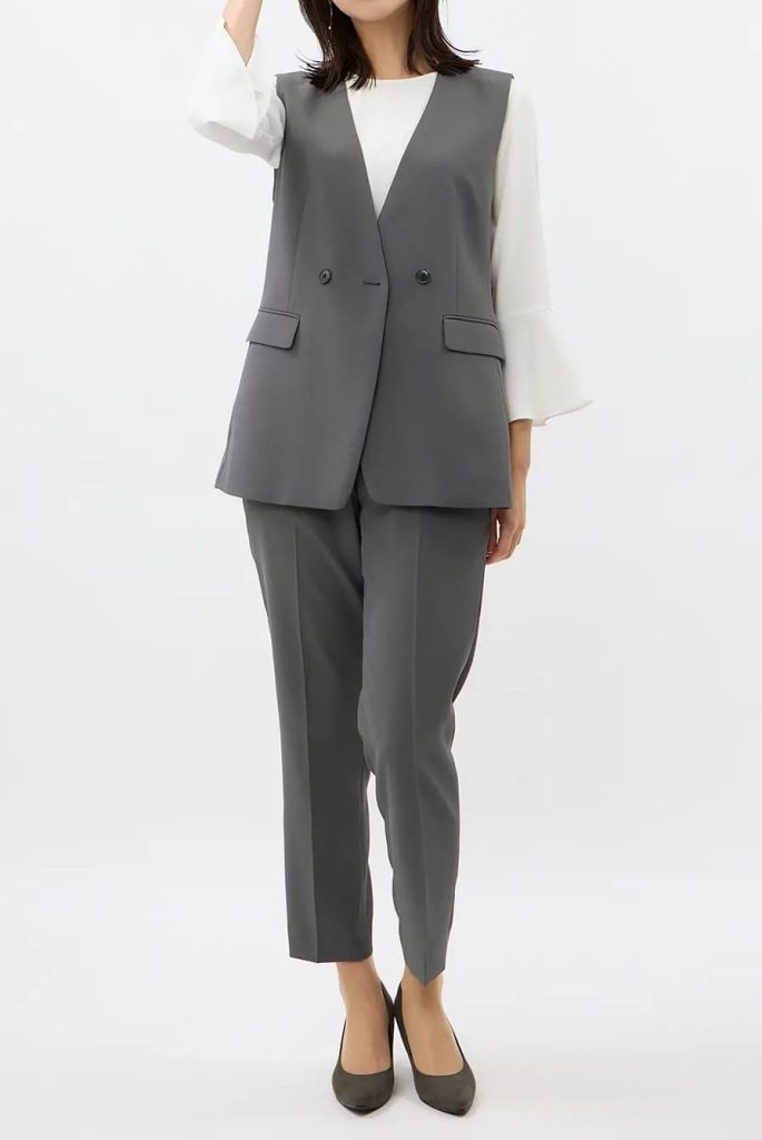 セットアップジレは、ほどよい抜け感がありつつ、きちんとした雰囲気が出せるため、オフィスカジュアルにもおすすめです。