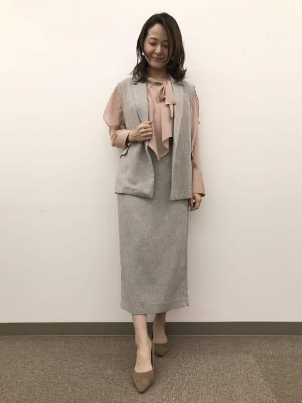 女性らしく上品なジレに淡いピンクのケープ付きブラウスが映えるコーディネートです。ボトムスにジレと同じ生地のロングタイトスカートを合わせれば、おしゃれなセットアップスタイルが完成します。落ち着いた雰囲気のなかに華やかさもあるコーディネートで、オフィスでも好印象を与えられるでしょう。