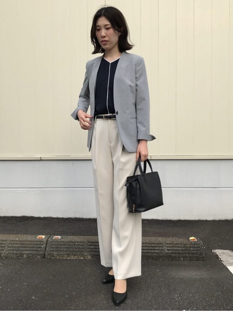 - オフィスカジュアル|ノーカラージャケット×ワイドパンツ