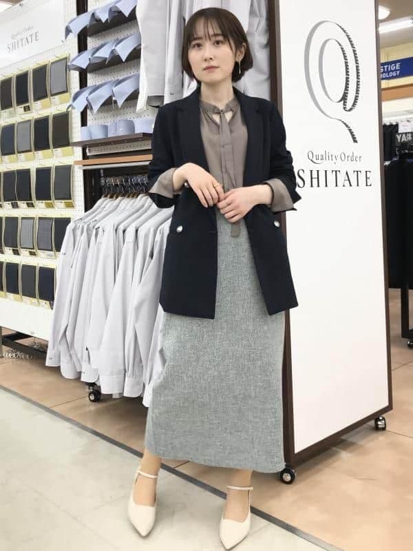 ネイビーは「誠実さ」や「信頼感」を与えてくれるカラーであるとされるので、どんな業界でもおすすめです。膝丈スカートは女性らしさがありつつ、きちんと感も両立できます。