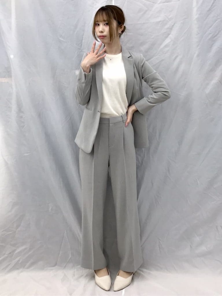 ブラックの無地スーツにグレーのトップスを合わせた、落ち着きのある大人コーデ。ジャケットはシルエットが美しく上品な印象に。テーパードパンツが脚元もスッキリと見せてくれます。
